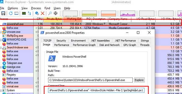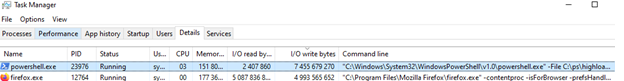 这将帮助您了解磁盘使用情况(进程是否主要执行读取或写入操作)并查看用于启动程序的命令行。在这种情况下,很明显,正在运行的 PowerShell 脚本会导致磁盘上出现高负载(*.PS1)。