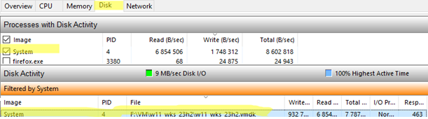 下面的屏幕截图显示了使用 VMDK 文件的 SYSTEM 进程的示例。上下文清楚表明这是一个VMware Workstation虚拟机文件,但从进程名称来看这一点并不明显。
