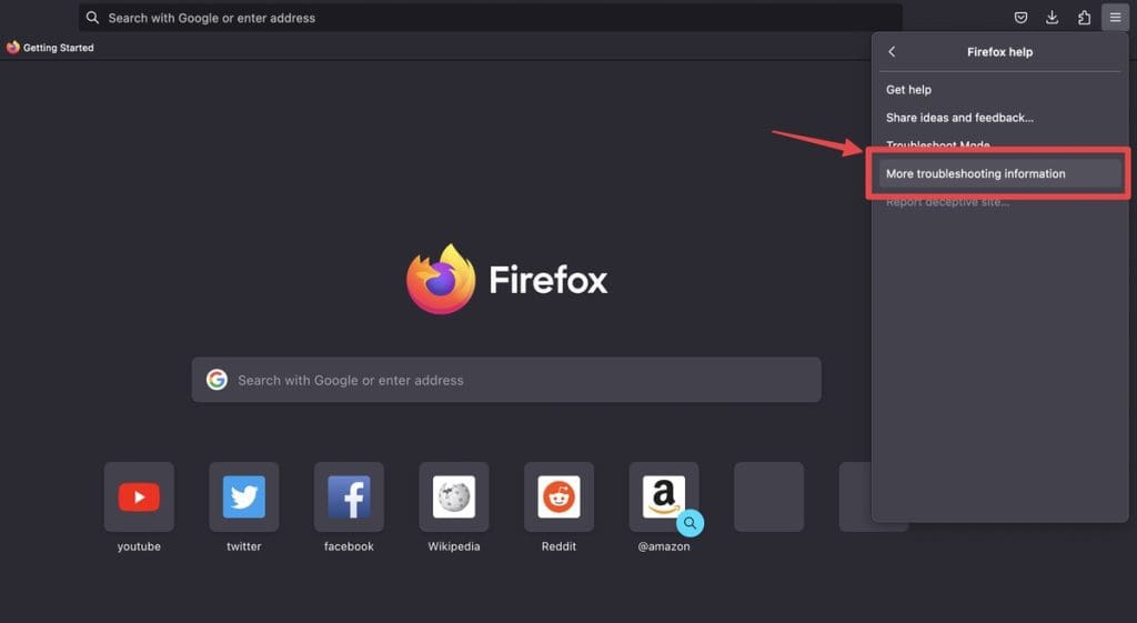 - 单击 Firefox 菜单,选择帮助,并选择更多故障排除信息。