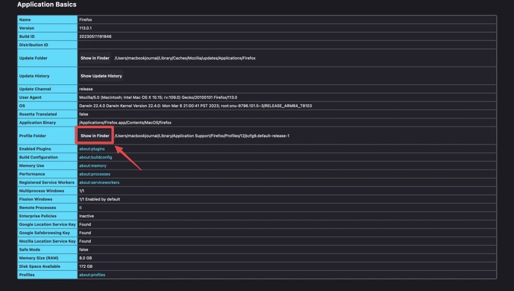 - 在“应用程序基础知识”表中,找到配置文件文件夹部分并单击在 Finder 中显示。
