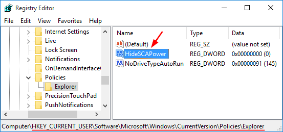 HKEY_CURRENT_USER\Software\Microsoft\Windows\CurrentVersion\Policies\Explorer - 寻找隐藏SCAPower注册表编辑器右侧窗格中的条目。如果不存在,右键单击空白处并选择新的->DWORD(32 位)值,然后将其命名为隐藏SCAPower。