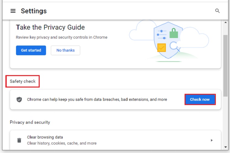 - 前往Chrome > 设置 > 隐私和安全。然后点击立即查看根据安全检查部分。完成后,您可以查看浏览器中是否存在任何危险的扩展程序。