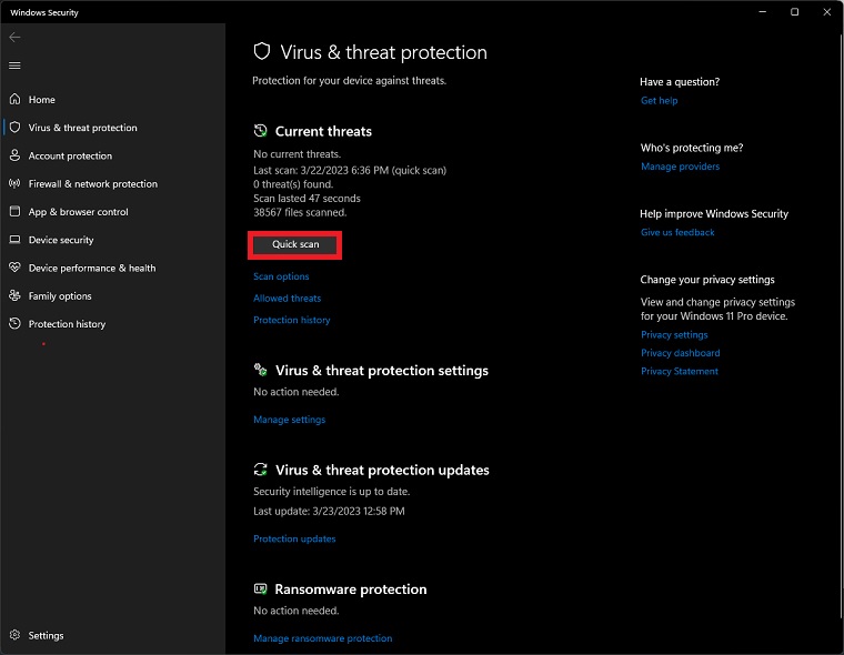 您可以使用 Windows Security 或第三方防病毒程序扫描您的电脑是否有病毒。前往设置 > 更新和安全 > Windows 安全 > 病毒和威胁防护。然后点击快速扫描并耐心等待该过程结束。