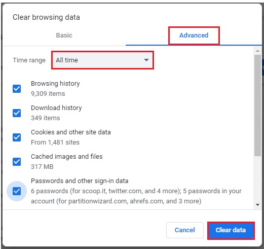 - 在弹出的窗口中,点击先进的选项卡并选择所有时间为时间范围选项。然后选择所有选项并单击清除数据。