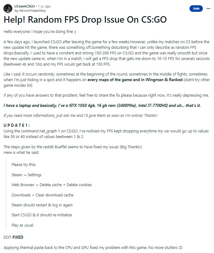 Reddit 上的一位用户报告称,更换 CPU/GPU 上的导热膏解决了 FPS 突然下降的问题。当 CPU/GPU 的温度过高时,通过将功率输入降低到较低温度来限制性能。当性能受到限制时,各种与 FPS 相关的问题(例如下降和卡顿)就会出现。