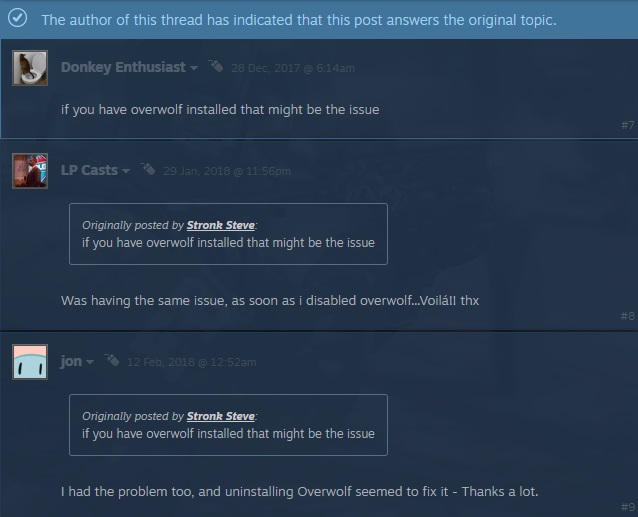 来源:Steam 社区成员确定问题是 Overwolf。卸载/禁用它可以解决该问题。