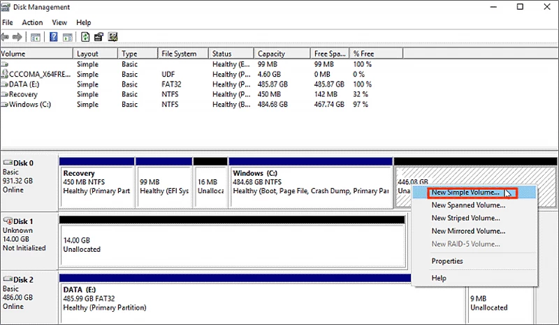 第4步:右键单击新的 M.2 SSD 并选择新建卷类型,然后按照新建简单卷向导的说明进行创建。