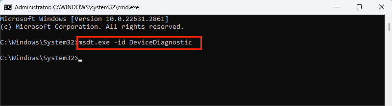 步骤一:按赢+R> 输入“指令” > 点击“Ctrl + Shift + Enter”按钮以管理权限运行,然后输入“msdt.exe -id 设备诊断” 打开硬件和设备疑难解答。