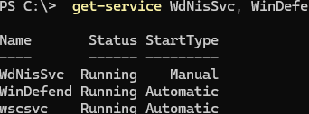 get-service WdNisSvc, WinDefend, wscsvc | select name,status,starttype