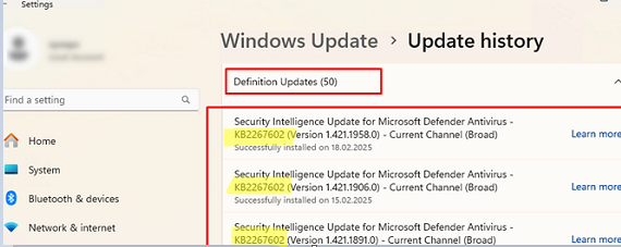 • 自动下载并安装 Microsoft Defender 更新通过 Windows更新。在 Windows 控制面板中打开更新安装历史记录 (ms-settings:windowsupdate-history)。请注意Microsoft Defender 防病毒软件的安全情报更新 —KB2267602(版本 xxxxxx)— 当前频道(广泛)在“定义更新”下更新。它通过 Windows 更新或企业 WSUS 服务器定期下载和安装。更新 KB2267602 包含定义和引擎更新。即使 Windows 更新服务被禁用,Microsoft Defender 防病毒软件也将继续使用其内置更新机制进行更新,如下所述。