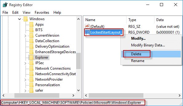 步骤5:最后,导航到键:HKEY_LOCAL_MACHINESOFTWAREPoliciesMicrosoftWindowsExplorer,删除名为“LockedStartLayout”的值。