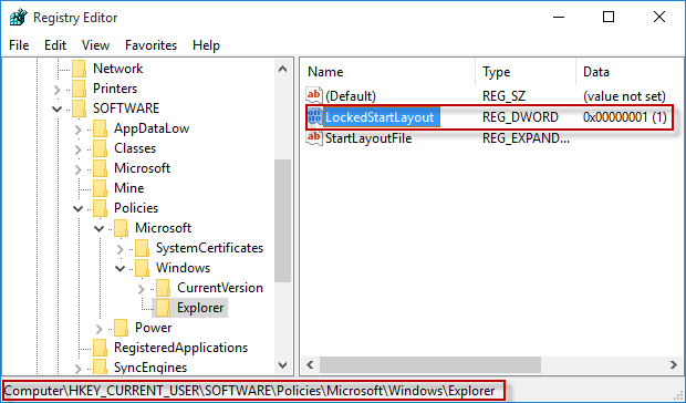 步骤 4:接下来,导航到键:HKEY_CURRENT_USERSOFTWAREPoliciesMicrosoftWindowsExplorer,然后删除名为“LockedStartLayout”的值。