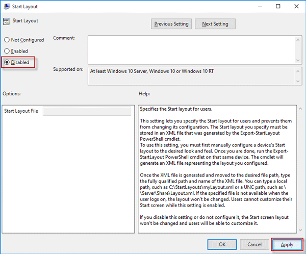 步骤 5:选择“禁用”或“未配置”,然后单击“应用”,然后单击“确定”。