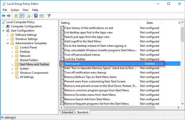 步骤 2:在本地组策略编辑器中,导航至用户配置 -> 管理模板 -> 开始菜单和任务栏。和开始菜单和任务栏选择后,在右侧窗格中查找名为“阻止用户自定义其开始屏幕”的策略设置,然后双击该策略。