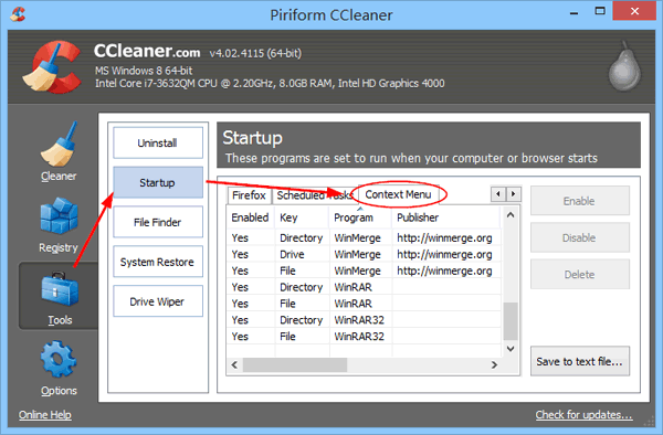 前往 Piriform 网站并下载 CCleaner 的免费版本。运行 CCleaner 后,单击工具左侧部分。在右侧,单击启动然后单击上下文菜单。从那里您可以禁用或删除任何第三方 shell 扩展。