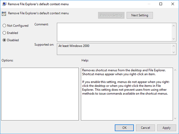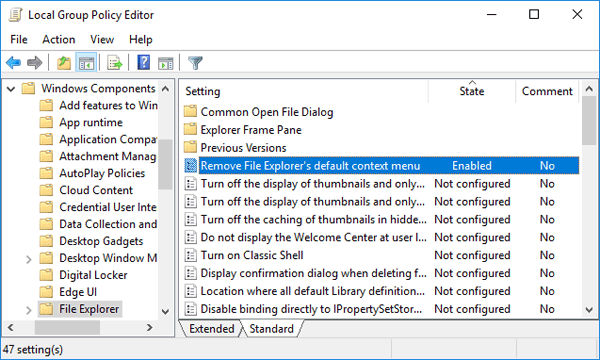 如果您无权访问本地组策略编辑器,请使用此注册表 hack 来启用 Windows 资源管理器的上下文菜单: