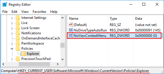 HKEY_CURRENT_USER\Software\Microsoft\Windows\CurrentVersion\Policies\Explorer - 双击 32 位 DWORD 值无视图上下文菜单在右侧,并将其设置为 0。(如果设置,它将禁用 Windows 资源管理器的上下文菜单无视图上下文菜单至 1)
