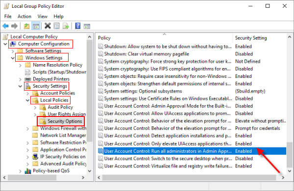 在右侧窗格中,双击用户帐户控制:在管理员批准模式下运行所有管理员。