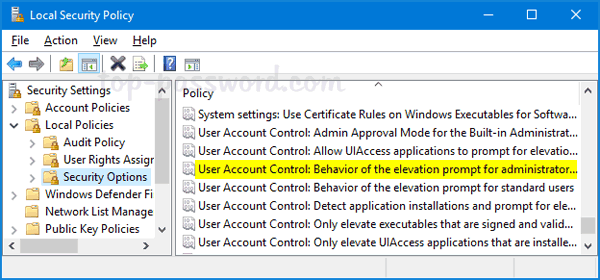 - 当本地安全策略窗口打开时,导航到安全设置- >地方政策- >安全选项。在右侧面板上,双击该选项“用户帐户控制:管理员在管理员批准模式下高程提示的行为“。