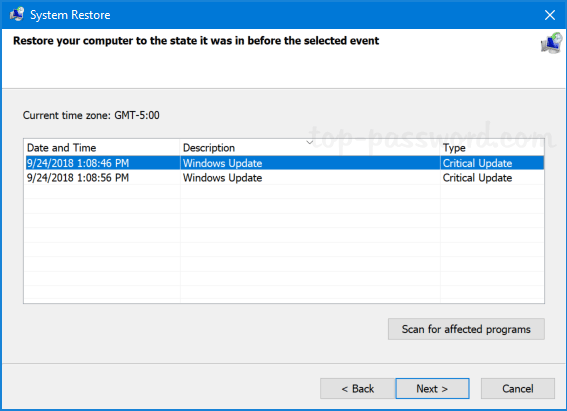 - 现在,您可以查看 Windows 10 系统上所有可用的最新系统还原点。在“照片”应用程序停止工作之前选择还原点,然后单击下一个。
