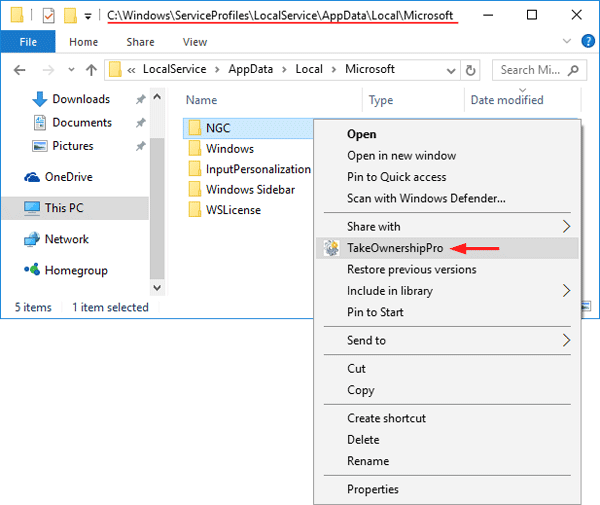 - 打开文件资源管理器并浏览到目录:C:\Windows\ServiceProfiles\LocalService\AppData\Local\Microsoft\NGC。您将被拒绝访问此文件夹,因此您需要获得 NGC 文件夹的所有权,这可以使用免费软件 TakeOwnershipPro 轻松完成