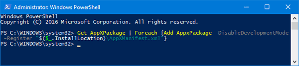获取 AppXPackage -AllUsers | Foreach {Add-AppxPackage -DisableDevelopmentMode -注册“$($_.InstallLocation)\AppXManifest.xml”}