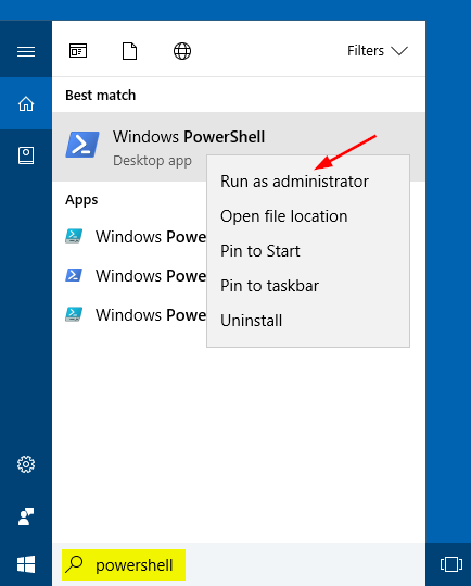 - 类型电源外壳在任务栏上的 Cortana 搜索框中。右键单击结果中的 Powershell 应用程序,然后选择以管理员身份运行。