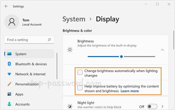 取消选中“当光线变化时自动改变亮度”框以防止 Windows 11 根据您周围的光线自动调整屏幕亮度,或者取消选中“通过优化显示内容和亮度来帮助提高电池电量如果您不希望屏幕根据屏幕上显示的内容更改亮度,请选中“框”。