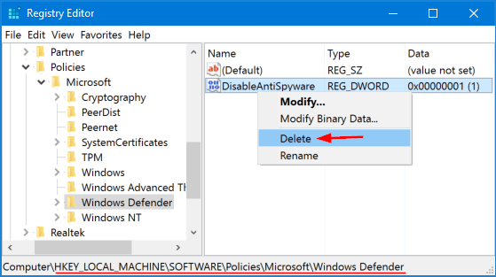 HKEY_LOCAL_MACHINE\SOFTWARE\Policies\Microsoft\Windows Defender - 右键单击禁用反间谍软件右窗格中的值,然后选择删除。