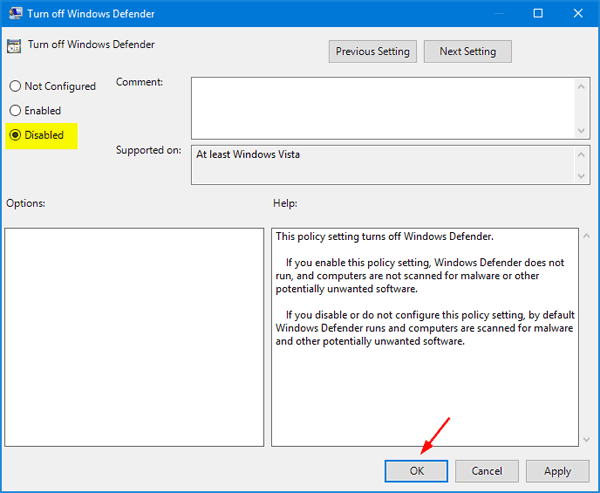 - 要打开 Windows Defender,请选择残疾人然后单击好的。
