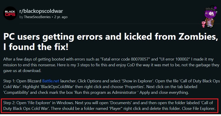 根据消息来源删除了这一点球员文档中的文件夹修复了使命召唤黑色行动冷战在启动时崩溃。