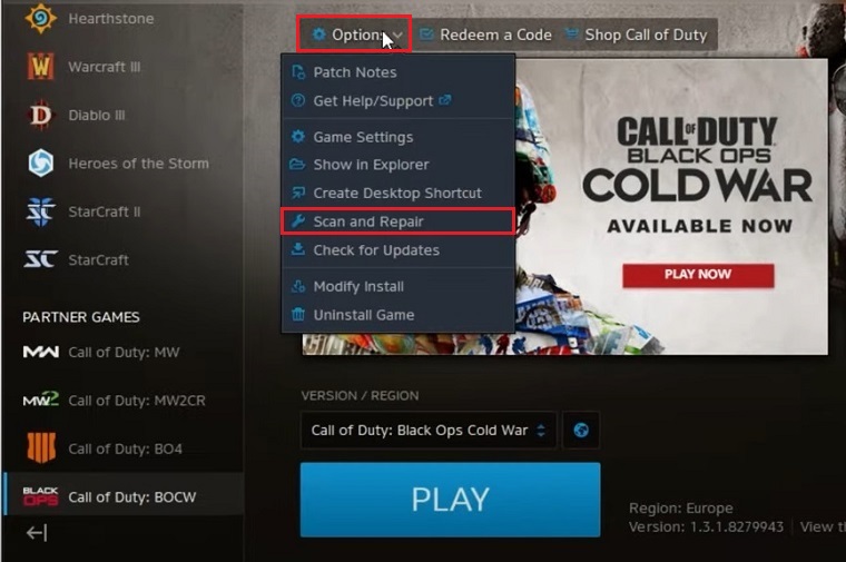 尝试游戏本身给出的修复是合乎逻辑的。因此,在进行其他修复程序之前扫描和维修《使命召唤黑战冷战》。您可以轻松地通过他们的battle.net游戏发射器。