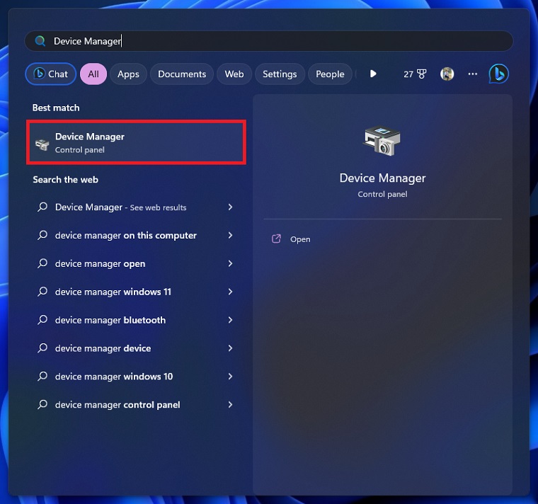 步骤1。在Windows搜索框中键入设备管理器并启动它。