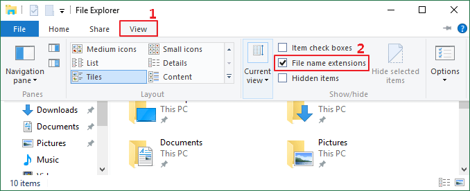步骤 1:访问文件资源管理器。切换到看法选项卡并启用该选项文件扩展名。