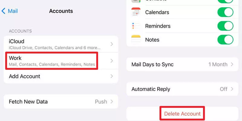 2. 点击任何工作或学校电子邮件帐户(通常是 Exchange),然后选择删除帐户。