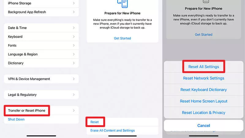 2. 点击传输或重置 iPhone > 重置 > 重置所有设置。