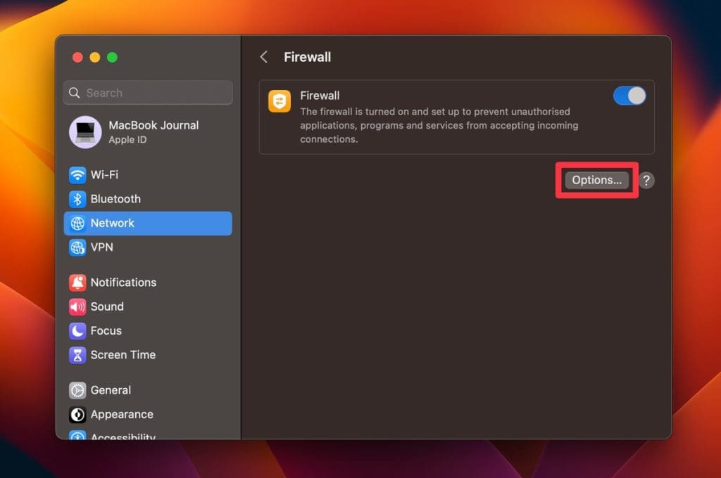 - 如果防火墙已打开,请单击选项按钮来查看设置。