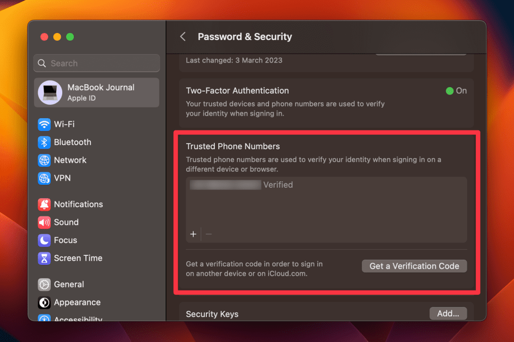 - 在“密码和安全”部分中,查找可信电话号码选项。