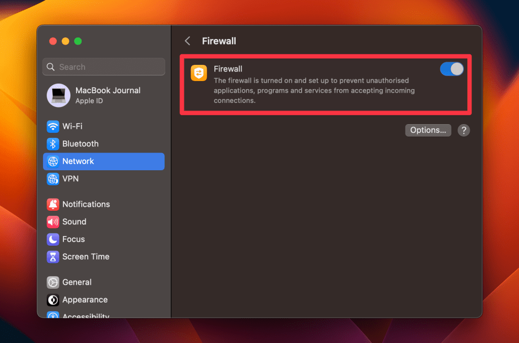 - 检查防火墙是否开启。如果没有,请打开旁边的开关防火墙。您可能需要输入管理员密码。