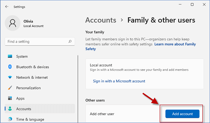 第 2 步:下其他用户部分,您可以单击添加帐户创建一个新帐户。