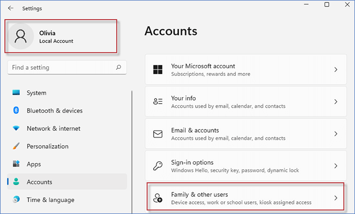 第 1 步:按Windows 键 + I进入设置。然后点击帐户名称并选择家庭及其他用户选项。