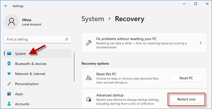 第 1 步:按Windows 键 + I转到设置。然后选择系统> 选择恢复。在恢复选项下,单击现在重新启动。