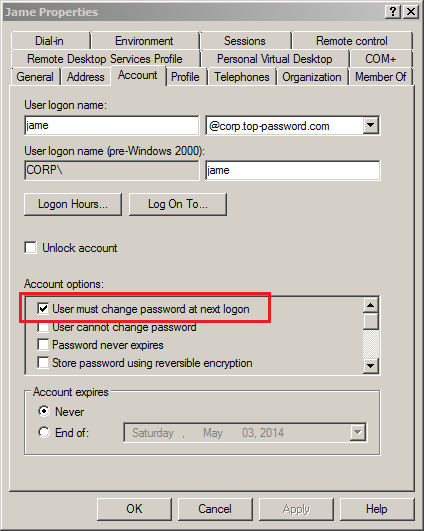 如何强制域用户帐户在下次登录时更改密码?只需打开Active Directory 用户和计算机通过选择“开始”->“管理工具”->“Active Directory 用户和计算机”,在 MMC 管理单元 (DSA.MSC) 中找到所需的 AD 用户。右键单击该帐户并选择属性。要强制帐户更改密码,只需勾选“用户下次登录时必须更改密码”复选框。