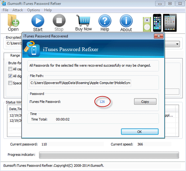 选择攻击类型后,单击开始按钮。然后程序开始访问您的 iPad 备份文件并发现其密码。只需几秒钟或几分钟后,密码就可以恢复并显示。