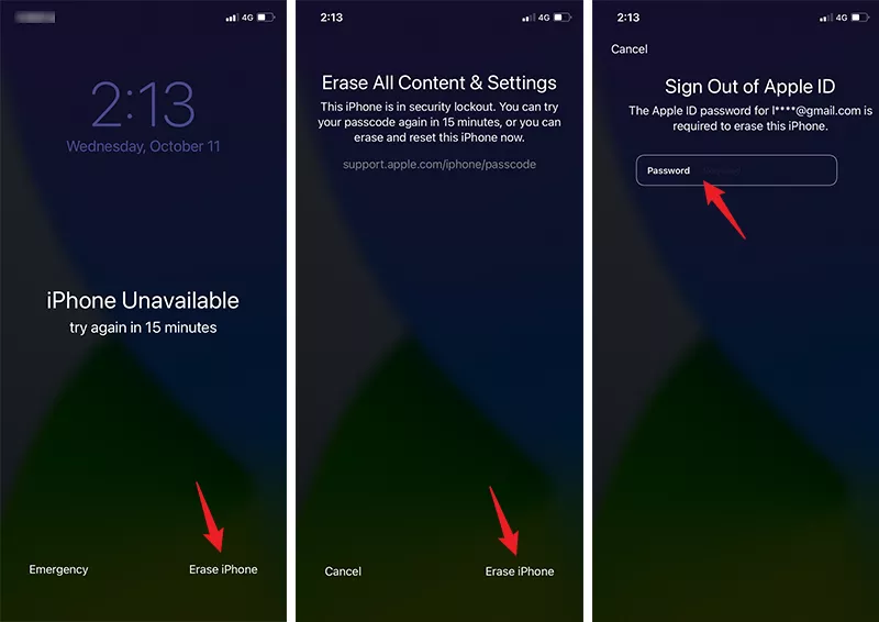 步骤2如果可以的话,再次输入密码,然后重复此操作,直到您在屏幕右下角看到“擦除 iPhone”按钮。