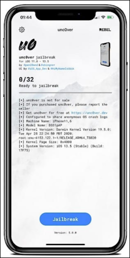 步骤8:打开 Unc0ver 应用程序并点击越狱按钮。越狱过程完成后,您将被引导至 Cydia 应用程序。