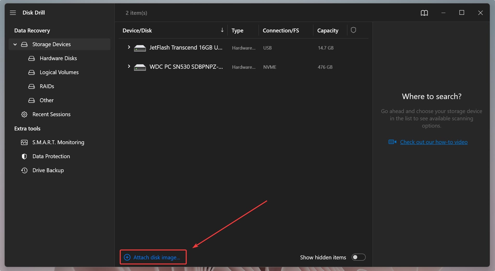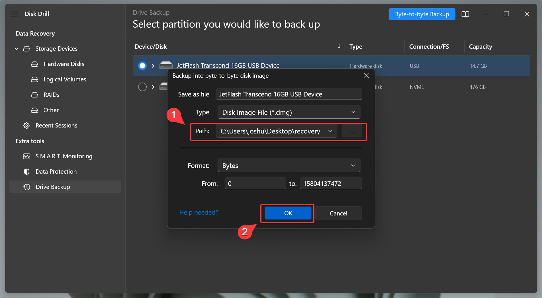 以下是如何使用 Disk Drill 创建带有后扇区的硬盘驱动器的字节到字节备份:
