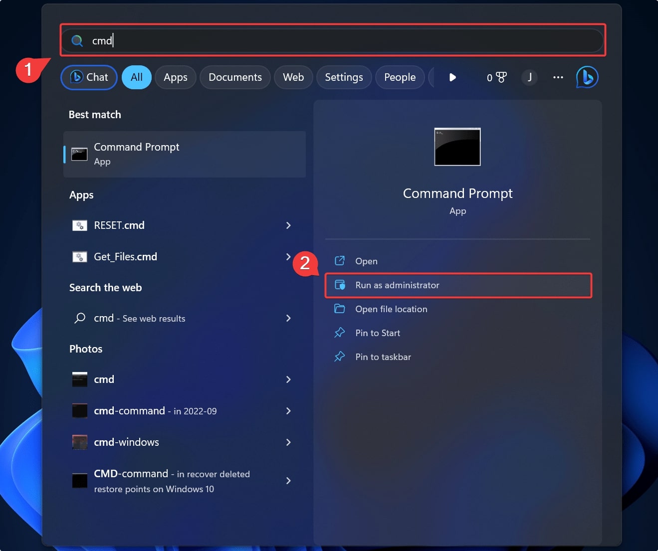 - 按 Windows 键,然后搜索指令管理指令。点击以管理员身份运行。