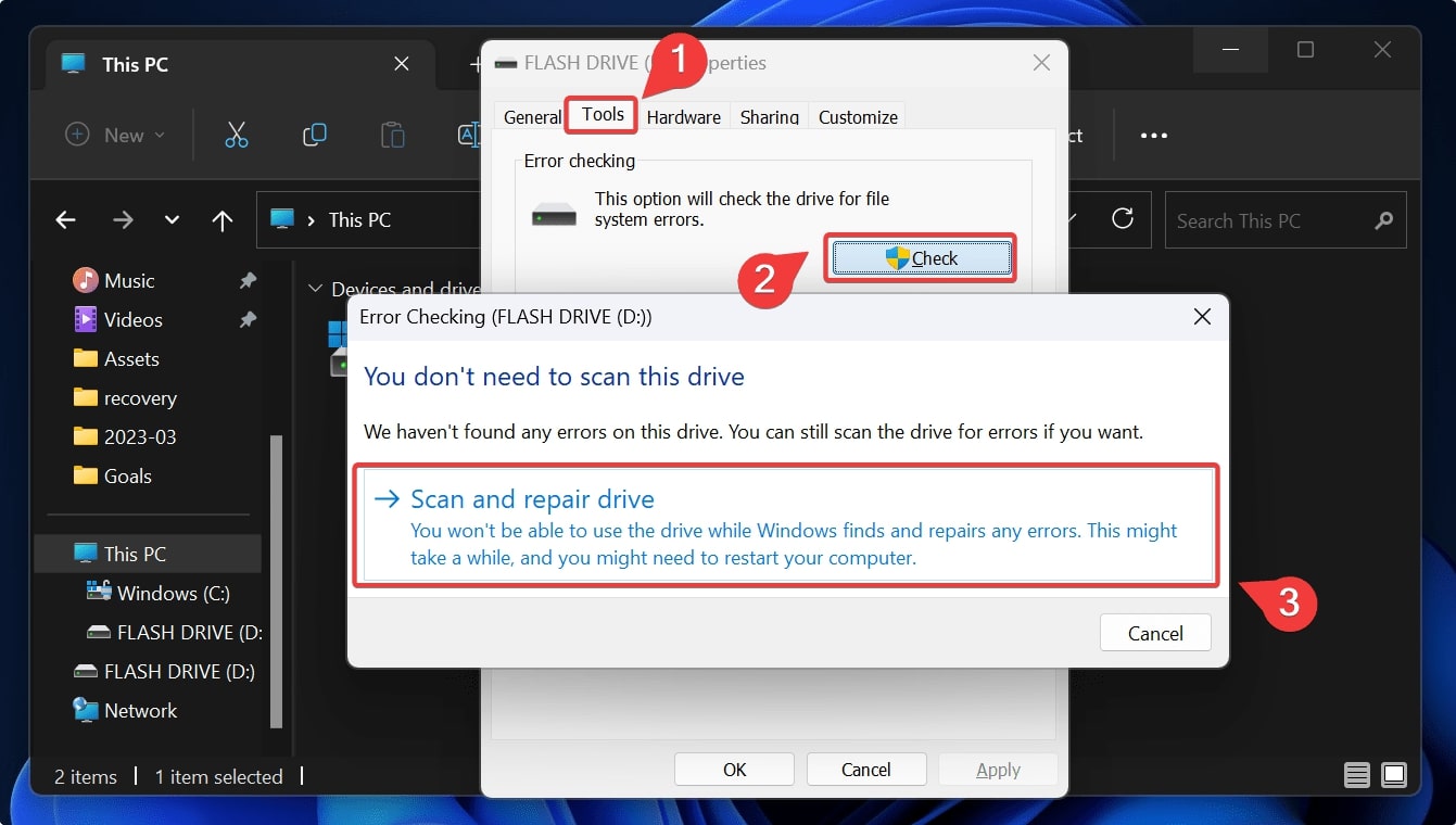 如果您不喜欢使用 CMD,还有另一种有效的方法,即错误检查工具。