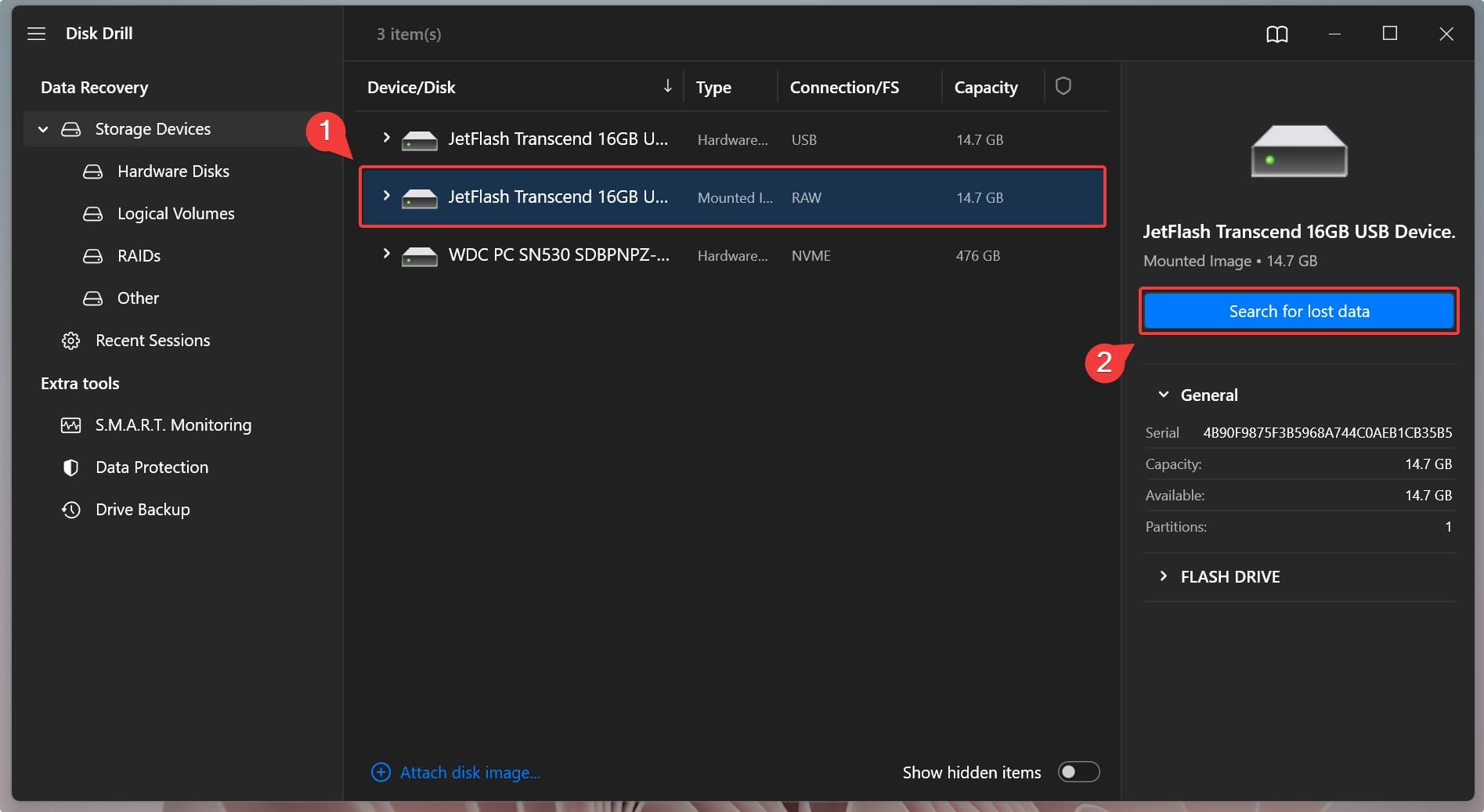 - 单击已挂载的磁盘映像,然后单击搜索丢失的数据。